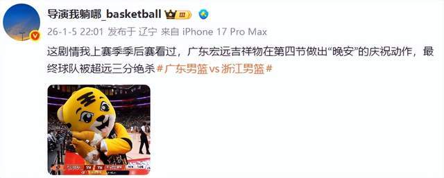 而辽宁媒体人导演我躺哪则是哪壶不开提哪壶,他在社交平台写道:“这剧情我上赛季季后赛看过,广东宏远吉祥物在第四节做出‘晚安’的庆祝动作,最终球队被超远三分绝杀。”
